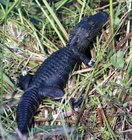 A young alligator basks in the sun