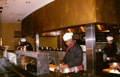 When you enter The Broad Street Grill, you are immediately drawn into the world of food. An antipasto station overflows with an extravagant selection of salad choices, marinated vegetables, seafood, cheeses and meats to start your meal with the most tempting tidbits. The dessert station abounds with every imaginable sweet to end the meal in a grand fashion. Another exciting feature that brings you up close and personal with every step in the preparation of your entree is the open kitchen. And oh what choices you have! Steaks and chops are the house specialty but seafood is not neglected. Salmon, snapper and tuna hold their own with the prime rib, lamb chops and every kind of beef cut. The vegetable accompaniments such as Grilled Vegetable Provincial, Sauteed Fresh Mushrooms and others turn your meal into a symphony of culinary delights.