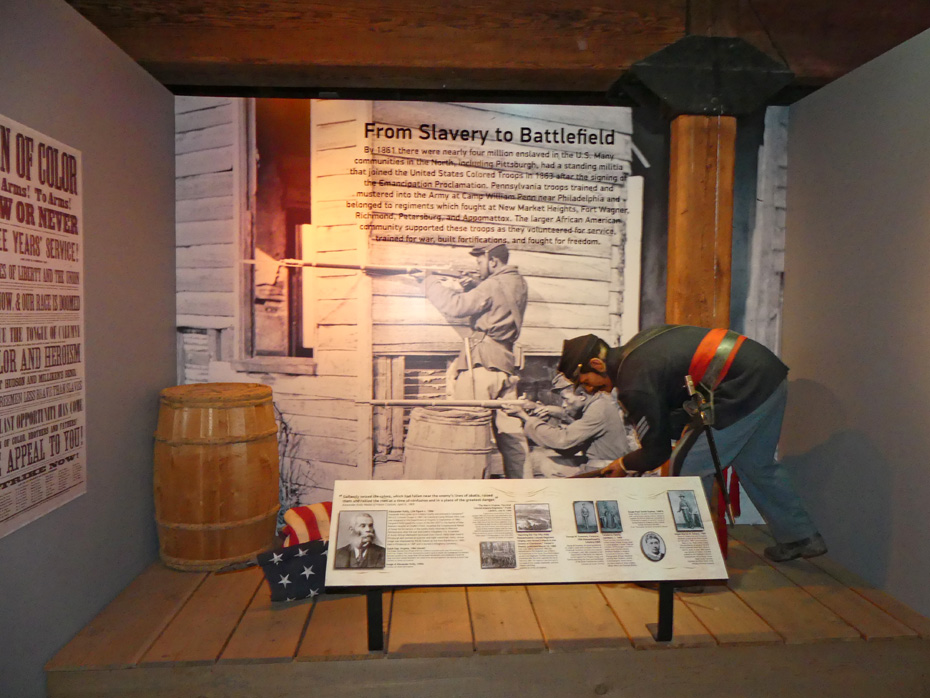 exhibit in Senator John Heinz Musuem in Pittsburgh showing Black Civil War soldier fighting