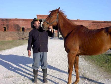 Middleburg, Florida resident Butch Waldron participated as a member of the 4th Massachusetts cavalry. Hebrought his horse Reinzi, named after Union General Phil Sheridan's mount. He participates in various Civil War events throughout the year. Like many other re-enactors, sometimes he switches sides and rides in Confederate gray. He said, "We're the only cavalry unit allowed to bring horses to Fort Clinch because of our professionalism and respect for the rules."