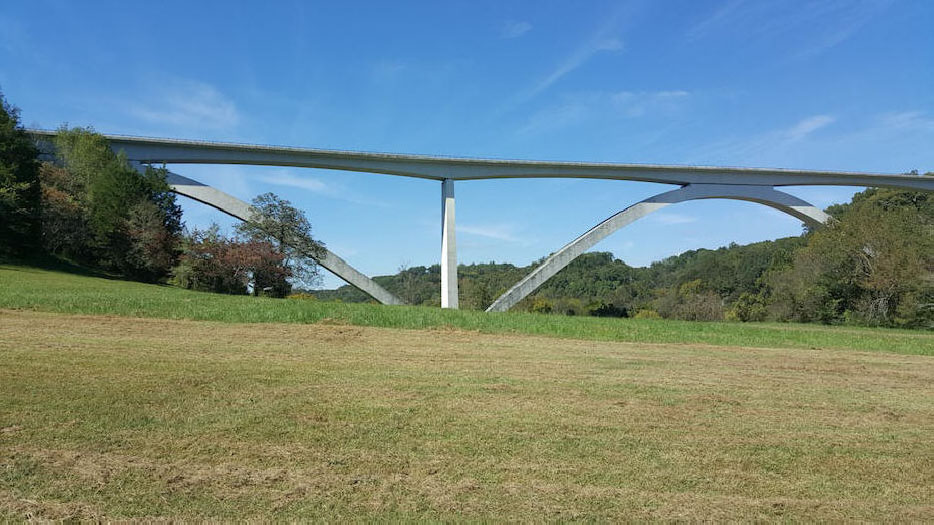 Nine-miles from the northern end of the Natchez Trace Trail stands the Natchez Trace Parkway Bridge, the nation's first double arch bridge and the first segmentally constructed concrete arch bridge in the country.  It is 1,572-ft. long, 145-ft. high and offers panoramic views. www.scenictrace.com