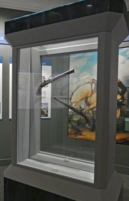 The second item and my favorite are two saddle pistols that were given to George Washington by the Marquis de Lafayette during the Revolutionary War.  There is a Trumbull painting in the display showing the pistols. Washington carried them at Valley Forge, Yorktown, and afterwards when he rode out at the head of American troops during the Whiskey Rebellion. Washington treasured them and in his will gave them to a cousin. Later the cousin realizing they are an important part of history gives them to a General he admired, Andrew Jackson. Jackson was not yet president at that time. When Lafayette returned years later on a tour, he visited Jackson's home and recognized the pistols. Jackson later gave them back to the Lafayette family but by then the Marquise was dead. Later, one of his family sold them at auction. A generous donor bought them and donated them to the museum. Imagine what a tale those guns could tell if pistols could talk.
