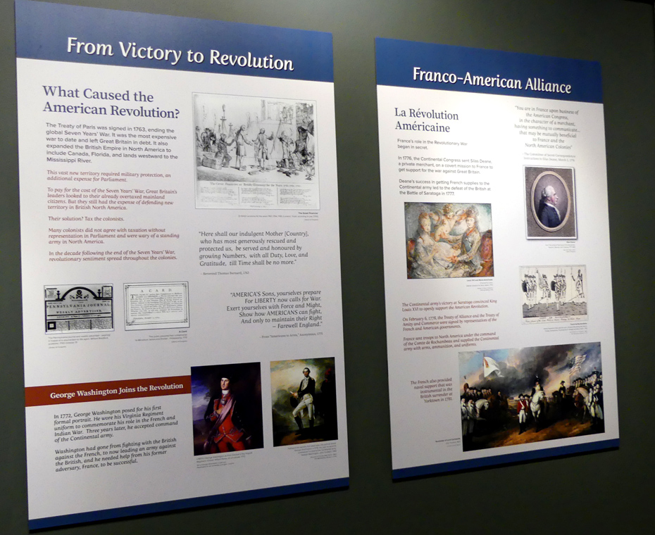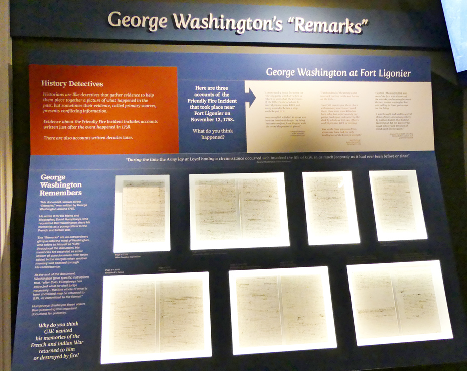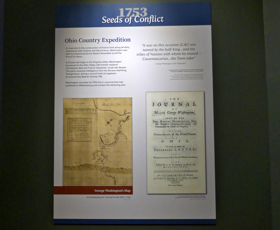 One panel talks about how an incident in 1753 involving Washington may have been the seed from which the French and Indian War grew. Washington was sent to the French forts on the Ohio River to tell them to leave. At the time he was just 21. He and hsi guid were led off the path by a Indian, possibly loyal to the French. When the Indian tried to shoot Washingotn and the guide, they disarmed him and escaped.