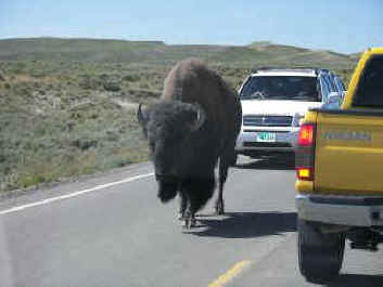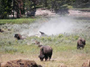 Bison, of course, own the park. We almost can imagine the 40 to 60 million bison that existed in the early day. There are some five thousand here in Yellowstone now (beginning with a group of about 30 in 1900). Occasionally we can go a day without seeing any but this year we have seen huge herds. I counted two herds close to each other in LaMar Valley and the total was close to 300 bison. The sight of the herd stretched out across a hillside is a thrilling, though small, echo of those huge herds of the early day. We watch them wallow in the dust and sidle up to the sulfur clouds around the mud pots to discourage insects. We watch the small, rusty-colored babies nurse, and watch the regal, old male saunter smugly down the asphalt leading a long, slow parade of cars, trucks and RVs. According to Ranger Harlan Kredit who leads the nature walk one Sunday morning, a group of five or six young bison stop traffic on Fishing Bridge and trot across each afternoon---a sight we have seen and laughed at ourselves. Ranger Kredit has worked summers in the park for 34 years, taught biology in the winter 44 years. We notice how many of the workers have a long history with the park. It is easy to fall in love with Yellowstone. How lucky we are that the government was wise enough to set it aside...though their motivation, like the motivation for Grand Canyon, was different from what we love today. Geology was the main draw here, too.